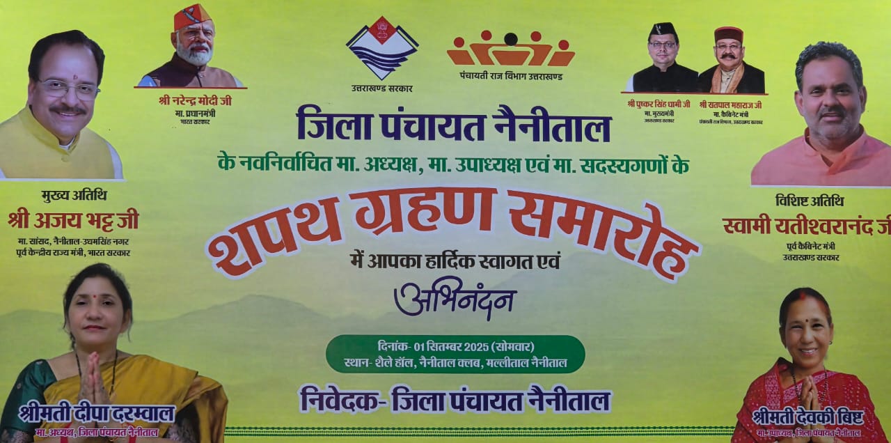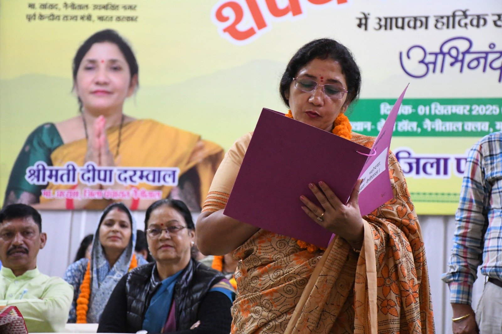 नैनीताल- सोमवार को नैनीताल क्लब (शैले हॉल) में आयोजित समारोह में अपर जिलाधिकारी शैलेन्द्र सिंह नेगी द्वारा सर्वप्रथम अध्यक्ष जिला पंचायत दीपा दर्मवाल एवं उपाध्याय देवकी बिष्ट को पद की शपथ दिलाई गई उसके उपरांत अध्यक्ष जिला पंचायत दीपा दर्मवाल द्वारा जिला पंचायत के सदस्यों को शपथ दिलाई।